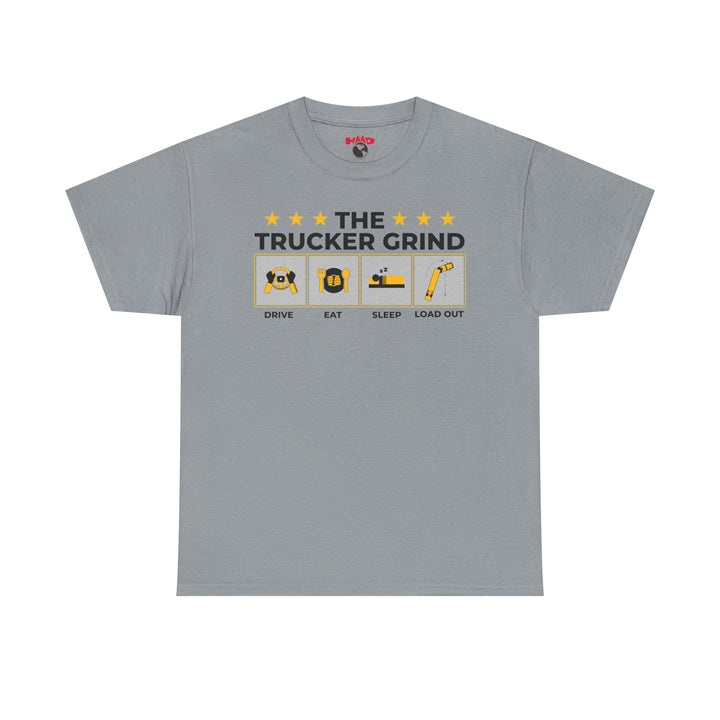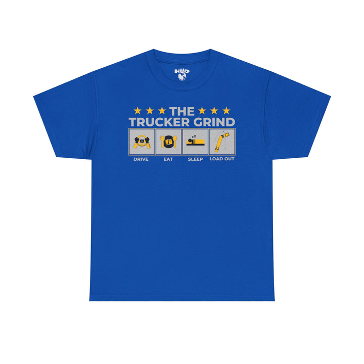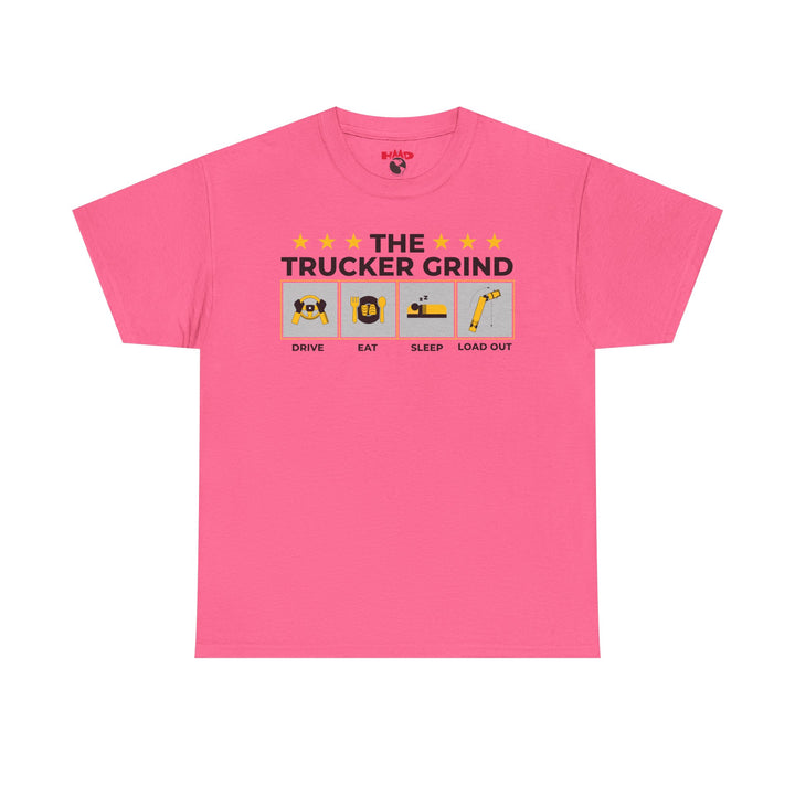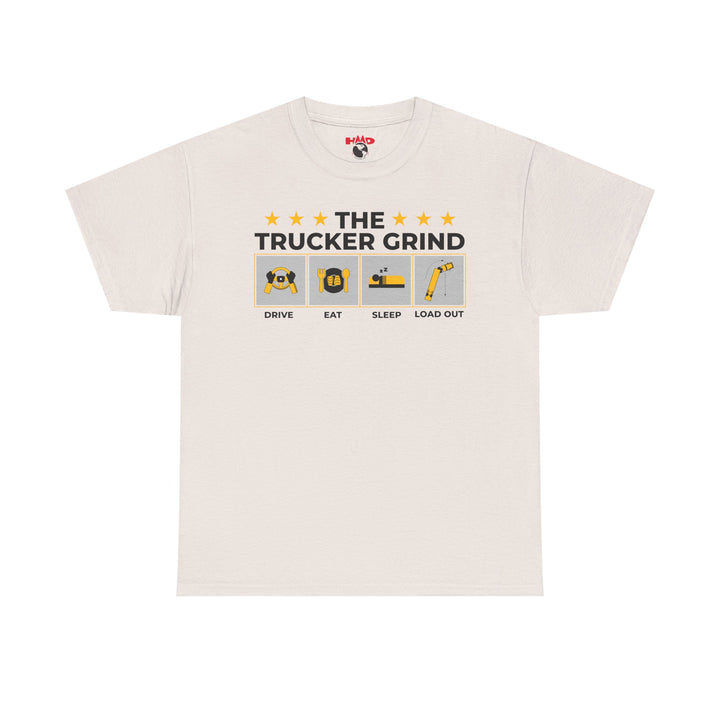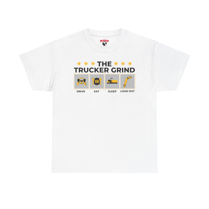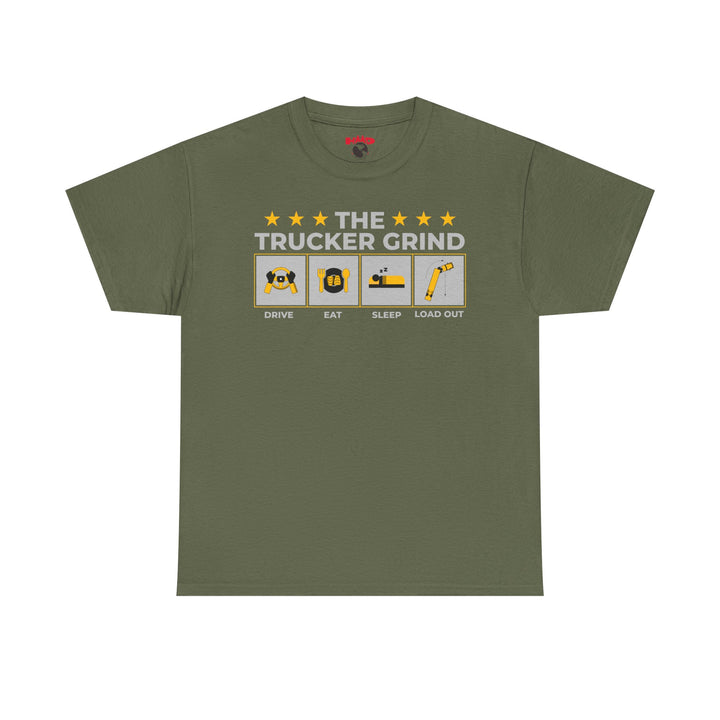 - Bold front graphic: “The Trucker Grind: Drive. Eat. Sleep. Load Out.” with road life icons